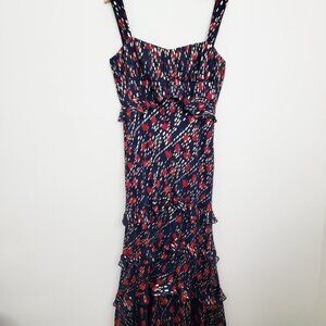 Saloni’s 'Chandra' dress is made from a silk-blend and has a metallic fil coupé rose petal pattern throughout that adds luster. It has a ruched bust and is traced with floaty cascading ruffles along the floor-sweeping skirt.