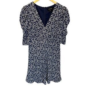 Navy and white print. V-neck. Ruched elbow length sleeves. Hidden zip up the back. Lined.