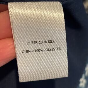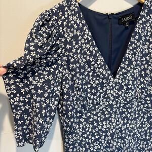 Navy and white print. V-neck. Ruched elbow length sleeves. Hidden zip up the back. Lined.
