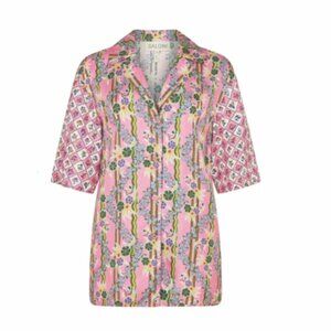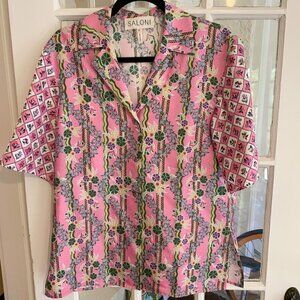 Saloni Dree Shirt In Verbena Print size 4 Our Dree Shirt in silk features the all-over Verbena print with a button down front and a notched collar. Notched Collar Button Down Front Opening Short Sleeves Wide Fit Exclusive Print 100% Silk