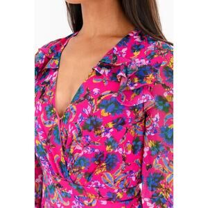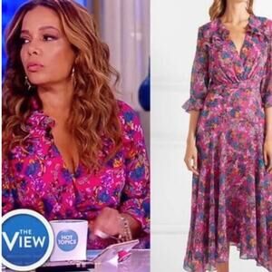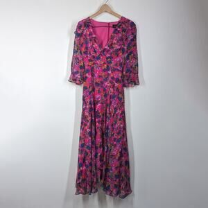 Saloni Edith Pink Floral V-Neck Midi Dress Silk Ruffle Size 0 Women's Preowned