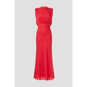 This elegant red lace SALONI dress radiates sophistication with a sleeveless high-neck design and a subtle waist cinch. The open back adds a touch of allure. Pair with strappy heels and a clutch for a polished look.