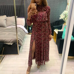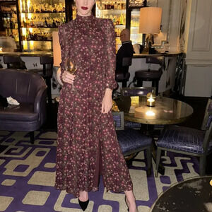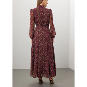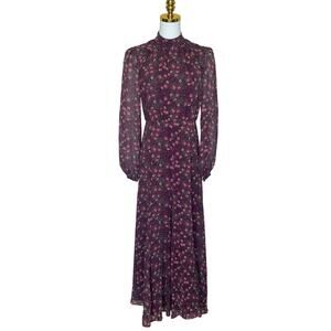 Saloni Burgundy Floral Chiffon Maxi Dress SIZE 8 Silk High Neck Side Slit Designer $795