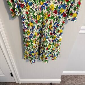 I am so in love with this super stunning high end designer SALONI white, green, yellow, red lemon floral abstract printed v neck puff sleeve mini dress