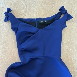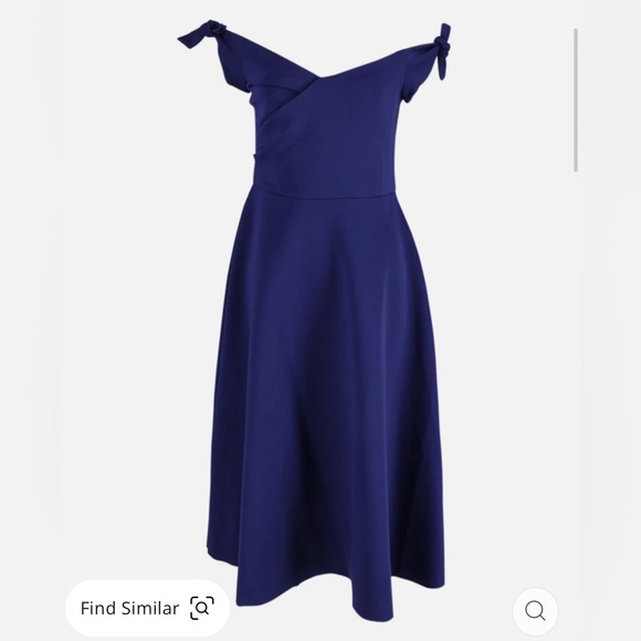 A sophisticated silhouette is achieved in this Saloni A-Line Dress. Designed with a blue polyester scuba fabric and pleated accents, it features an off-the-shoulder neckline and concealed zip closure at back.
