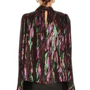*Like New! Saloni Tania Top in Metallic Rainbow. In 2011, fashion designer Saloni Lodha launched a brand inspired by her nomadic lifestyle. She took inspiration from her childhood, drawing on the vivid colours of her grandmother's sarees and the cherished memories of summers spent visiting Jain temples in Rajasthan.