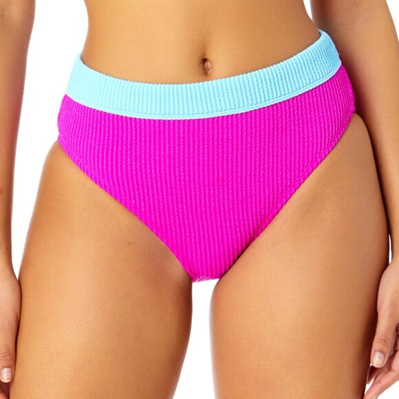 Stand out in bold summer style with this Salt + Cove juniors' colorblocked ribbed bikini bottom! Featuring a vibrant pink body with a bright sky blue waistband, this high-waist swim bottom brings playful colorblocking and ribbed texture together for a flattering and comfortable fit. Perfect for beach days, pool parties, and vacations. Crafted from quick-dry, stretchy fabric for all-day wear.