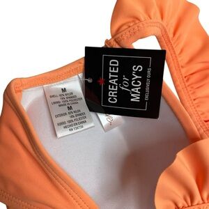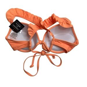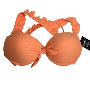 Top: Ruffle Strap Push-Up Underwire Bikini Top, non-removeable cups, tie closure at back, adjustable ruffle straps criss cross at back and adjust by tying different length, sweetheart neckline, tie accent at center front. Color: peach (orange)