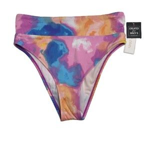 Bottoms: Tie-Dyed Bikini Bottoms, sits at waist, moderate bottom coverage, lined, ribbed textured material. Color: tie-dye pink, blue, peach/orange, orchid purple, and white