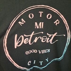 Black long sleeve graphic t-shirt with a retro Detroit “Motor City Good Vibes” circle logo in pink and blue. Soft cotton blend, lightweight, and easy to style with jeans or leggings for a casual look.