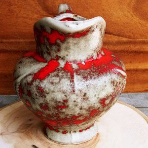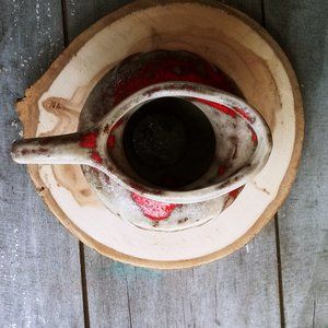 Check out this gray and orange salt glazed white stonewear pitcher. Now, this is stumping hubby who is my ceramic go to guy. The glaze on this appears to make up the eagle on both sides and you can see that they are a bit different. It has a wonderful surface that has that orange peel feel from the salt glaze. You could just rub your hands on it all day, feels awesome. Artist unknown but genius! 4.5" tall X 5" wide. Please let me know if you recognize the mark. Thanks!!