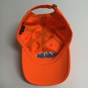 Hat is a bright neon orange. Nice boating or fishing hat. Has a thick aqua blue and black embroidered logo and an aqua embroidered marlin on the side. Quality made.