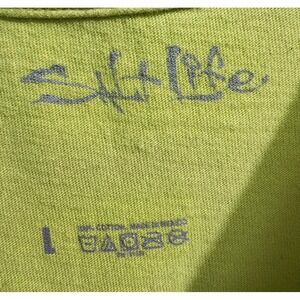 A vibrant chartreuse Salt Life T-shirt, perfect for casual wear and fishing enthusiasts. This short-sleeve tee features a convenient chest pocket and the Salt Life logo on the front. The back showcases a large, eye-catching graphic of a marlin fish, adding a unique touch. Ideal for a day out on the boat, a casual beach gathering, or simply relaxing on a sunny afternoon.