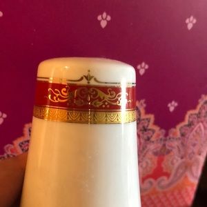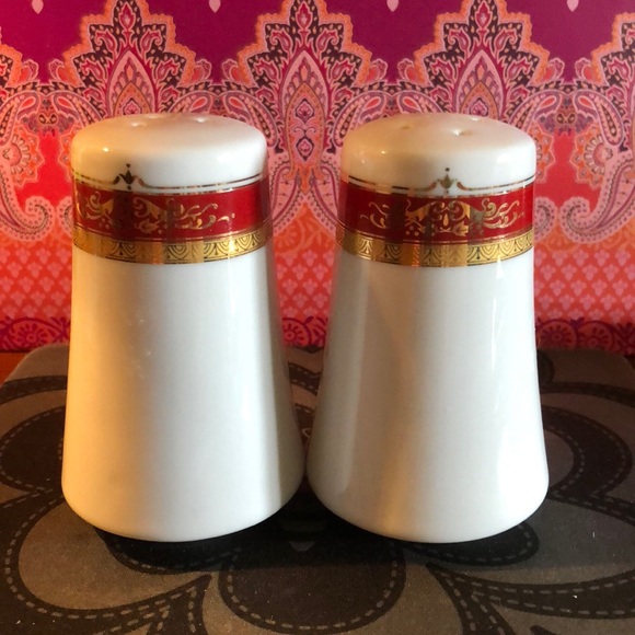 Lovely set. White with decorated with red and 14k gold. They measure 3-1/2” H AND 2-1/2” across at the base. Clean inside. Never used.