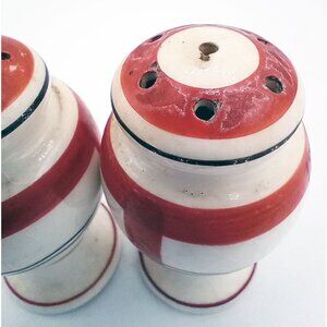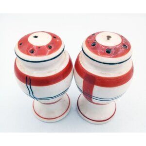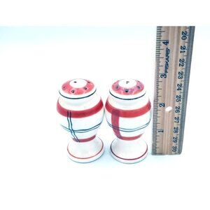 Enhance your dining table with this vintage salt and pepper shaker set that has a charming plaid design. Crafted in Japan, these red, white, and black shakers are 2.75 inches tall and are heavily crazed, adding a touch of retro elegance to your kitchen decor.