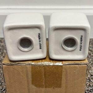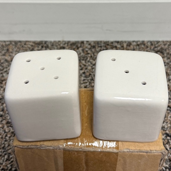 White ceramic salt and pepper shaker set. These are not stark, cool white but a warm white. Brand new with box. Bought 2 dish sets and didn’t need the accessories from the second set