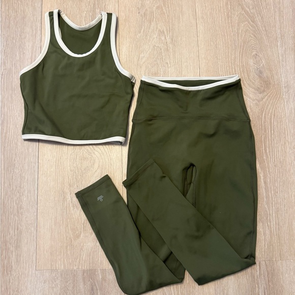 Stylish olive green activewear set with white trim. Includes a sleeveless top and matching leggings.
