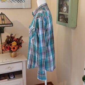 Channel your inner Cowgirl in this plaid top. Snap front, pockets and cuffs. Pretty plaid. Western styling. Size M measures 42 at chest, 42 at bottom, 29 long from shoulder to hem. Sleeves 26. Washed to comfortable softness.