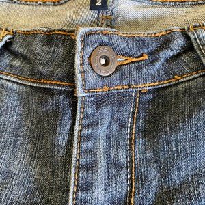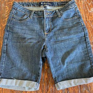 SALT WORKS ~ New York City ** Midrise Bermuda Shorts ~ Medium-wash DENIM JEANS Shorts ** 65%cotton/33%polyester/2%polyurethane for COMFORT & STRETCH. Traditional 5-pocket jeans style (front pockets are rounded) ~ large BACK POCKETS have intricate BLUE and WHITE STITCHING ~plus~ CRYSTALS (or tiny rhinestones) for BLING! ... size 2