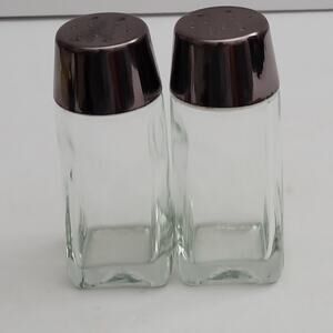 This is a pair of clear glass salt and pepper shakers, each featuring a square base that transitions to a round opening at the top. Both shakers are topped with dark, possibly chrome or silver-toned, metal lids with perforations for dispensing. The design is functional and classic, suitable for a dining table or kitchen.