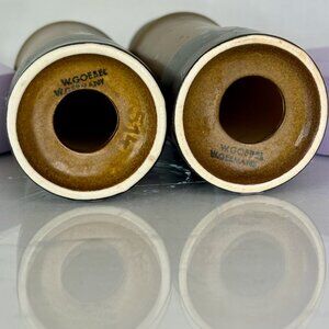 This is a vintage W. Goebel West Germany ceramic salt and pepper shaker set, featuring a sleek mid-century modern design. The shakers have a matte brown and black glaze, with a minimalist cylindrical shape and rounded tops. The bottom is stamped with "W. Goebel W. Germany," indicating the set was made by the renowned German porcelain manufacturer Goebel, known for its high-quality craftsmanship. 6 inches tall.