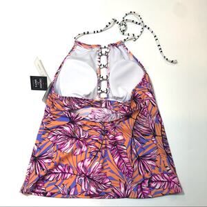 The high-neckline silhouette features strappy details between the bust and a cutout at the back. Removable cups. Hits at waist. Pull-on styling; halter straps tie at back neck. High neckline with strappy detail between bust; cutout at back. Lined.