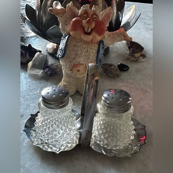Salt Pepper Shakers with silver tray Vintage Grace Glass Diamond Cut