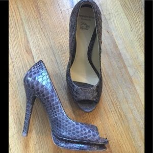 Amazing Alexandre Birman's Salto Meia Pata Python Platform Pumps in Storm. Worn infrequently. Review pictures. Legally sourced python but unsure if it can be shipped to CA.