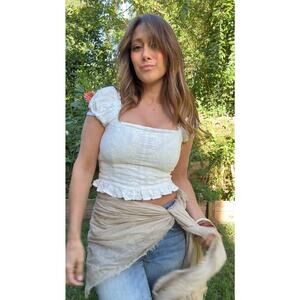 Straight out of a countryside daydream. This embroidered puff-sleeve top has a square neckline, smocked back, and ruffled hem — romantic detailing styled here with denim to feel modern. LA brand, Saltwater Luxe.