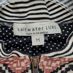 This Saltwater Luxe jacket is a mid-length, zip-up bomber style coat in a geometric Aztec pattern featuring colors of brown, black, and white. It is made of 100% Rayon with a similar lining, suitable for casual occasions. The jacket has long sleeves and a knit fabric type, with a regular fit for women size M. Ideal for all seasons, it has accents of geometric design, embodying a Western boho chic theme. Made in the United States.