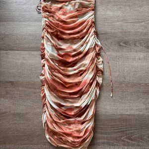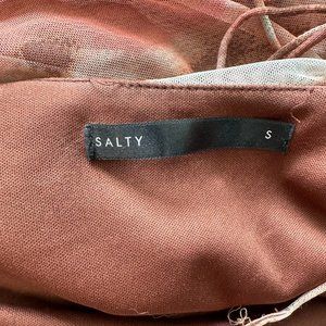 Salty Brand Small Bodycon Mini Dress with asymmetrical hem. Lace up back that can be worn as straps or strapless. Mid-thigh length. Size Small - true to size. Comfortable and breathable - perfect summer dress!