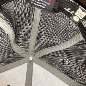 Charcoal trucker hat with Salty Crew patch. Features fish graphic and coordinates. Flex fit