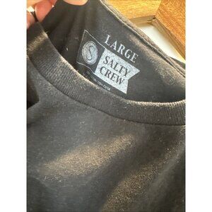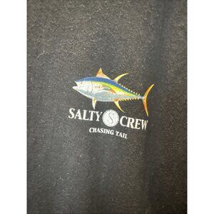 The Salty Crew Chasing Tail black t-shirt in size L is a stylish and comfortable piece of clothing for men. Made from cotton jersey fabric, it features a graphic print of a fish theme, perfect for those who love the outdoors. The short sleeve and crew neck design make it easy to wear and care for, as it is machine washable. With a regular fit and the trusted Salty Crew brand, this t-shirt is a great addition to any casual wardrobe.