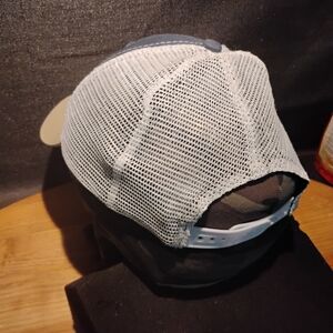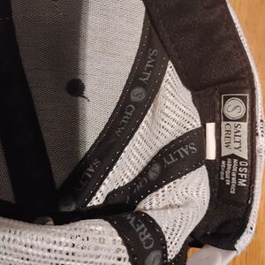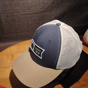Salty Crew trucker hat in navy and tan. Features mesh back and logo patch.