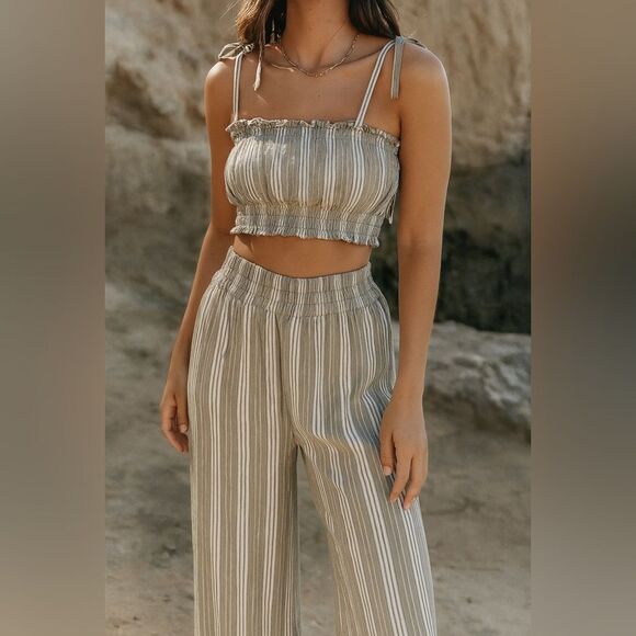 Get ready for effortless summer vibes with this adorable Salty Lemon two-piece set! Made from a breezy linen-blend fabric, this outfit includes a smocked crop top with adjustable straps and a matching pair of flowy wide-leg pants featuring a comfy elastic waist. 💨✨