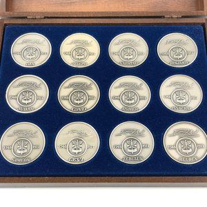 Each of the 12 Tribes of Israel(Asher, Benjamin, Dan, Gad, Issachar, Joseph, Judah, Levi, Naphtali, Reuben, Simeon and Zebulun) are depicted on 12 individual Silver Coins, each bearing an image created by Salvador Dali with the name of the tribe. On the edge of each medal is the inscription "Medallic Art Co, NY .999 + Pure Silver," along with a serial number. All serial numbers match. Salvador Dali's signature is inscribed onto each medallion.