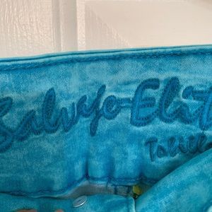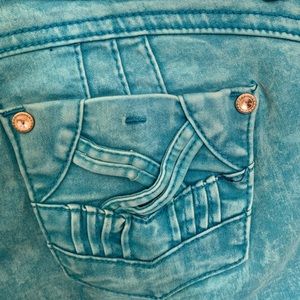 Pair of cool stretchy joggers by Salvage with manufactured rips. Jogger pants has a zipper on pant leg. Bottons on front and back have rhinestone look. Size 13/14