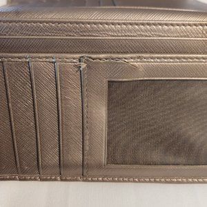 Salvator Ferragamo Gold Continental Wallet with Gancini Logo. Has been quite used and unfortunately the mesh pocket used for IDs it torn slightly. However although its been broken in a bit it is still a beautiful piece