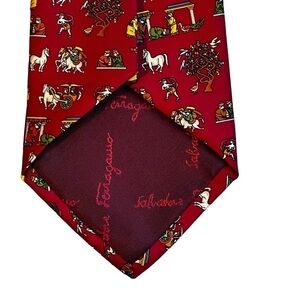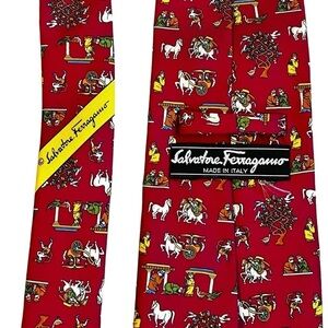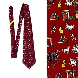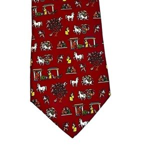 Salvatore Ferragamo 100% Silk Neck Tie Asian Horses People Micro Print Red Italy