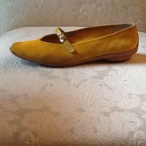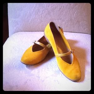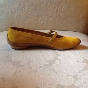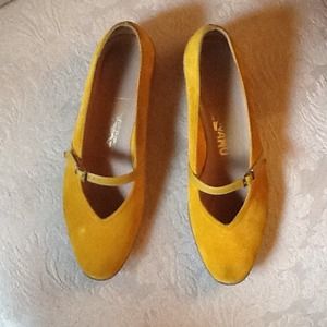 Mustard suede with over the top adjustable leather buckle. Wood sole around the shoe.