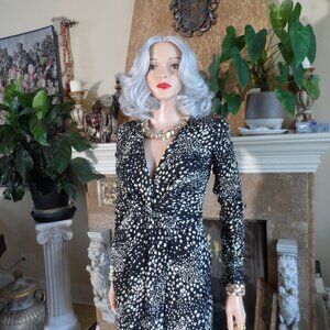 Elegant Salvatore Ferragamo dress in a black and beige abstract print, featuring a flattering ruched silhouette and faux wrap design. Crafted in Italy from textured wrinkle-effect fabric, this unlined style includes a hook-and-eye closure at the waist and zippered cuffs for a refined finish. Perfect for sophisticated day-to-evening wear. Size: IT 38 (US 2). Design: Faux wrap with ruched detail. Closure: Hook-and-eye at waist, zip at cuffs. Fabric: Textured wrinkle-effect. Unlined. Made in Italy. Measurements are approximate: Shoulders 13", bust 32", waist 26", hips 34", length 38". In excellent pre-own condition. Retails for $2900. This dress is gorgeous! Comes from a smoke free home.