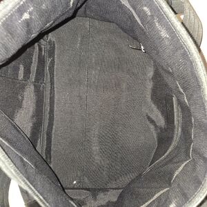 Salvatore Ferragamo Black Canvas Shoulder Bag with Silver Hardware features leather trim, large interior storage, interior zip pocket, and zip closure. Measures: 14"Wx7.25"Hx7"D with 8.75" handle drop.