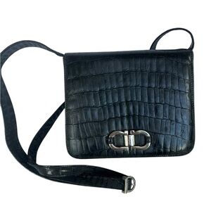 Elegant black croc embossed crossbody bag by Salvatore Ferragamo. Features a chic silver clasp. In excellent condition with minor wear. Inside is spotless. Comes with a long adjustable shoulder strap. Also comes with original price tags and authenticity card.