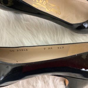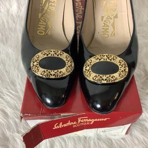 This is a pair of black patent leather, low heel pumps heels with an elaborate scrollwork gold tone medallion on the toe from Salvatore Ferragamo. Made in Italy. Comes with box. Some wear on foot beds and soles. Light scratches on toes. Writing on one sole. 7 AA, double A, narrow. Vintage 1970s, 70s, 1980s , 80s. Evening, party