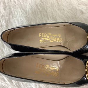 Salvatore Ferragamo Black Ginkana Gold Medallion Pumps Low Heels 7 AA