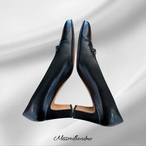 These Salvatore Ferragamo heels feature a classic black leather design with a squared-off toe box and a medium heel height, perfect for professional settings. The shoes are crafted with subtle decorative stitching on the toe area, offering a touch of elegance. Their solid construction ensures durability and comfort for everyday wear.