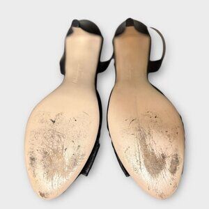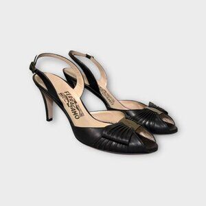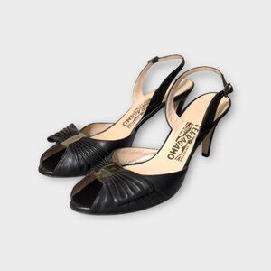 Salvatore Ferragamo Black Leather Bow Slingback Sandals 7M Peep Toe Retro Classy