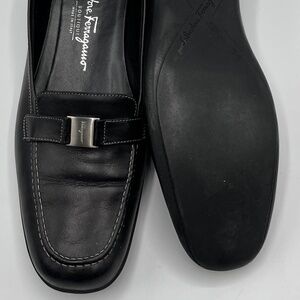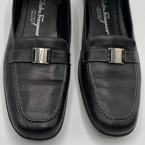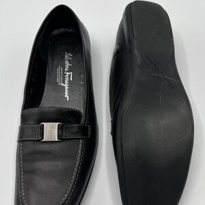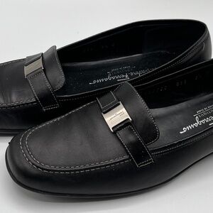 Elegant black leather loafers with silver buckle detail. Classic design by Salvatore Ferragamo.