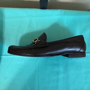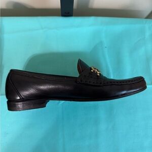 Elegant black leather loafers with signature gold hardware. Perfect for sophisticated style. Size:5B; Condition: Very Good; Interior leather shows signs of wrinkles and wear; Exterior leather in very good condition; minor rubs on side of one shoe; has new heals and soles.
