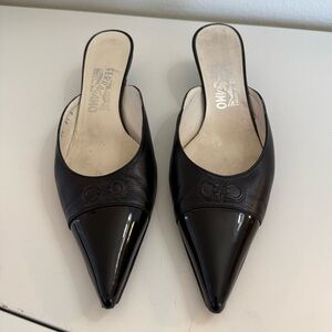 Elegant black leather mules with signature logo detail. Sleek and stylish design. Perfect for any occasion.
